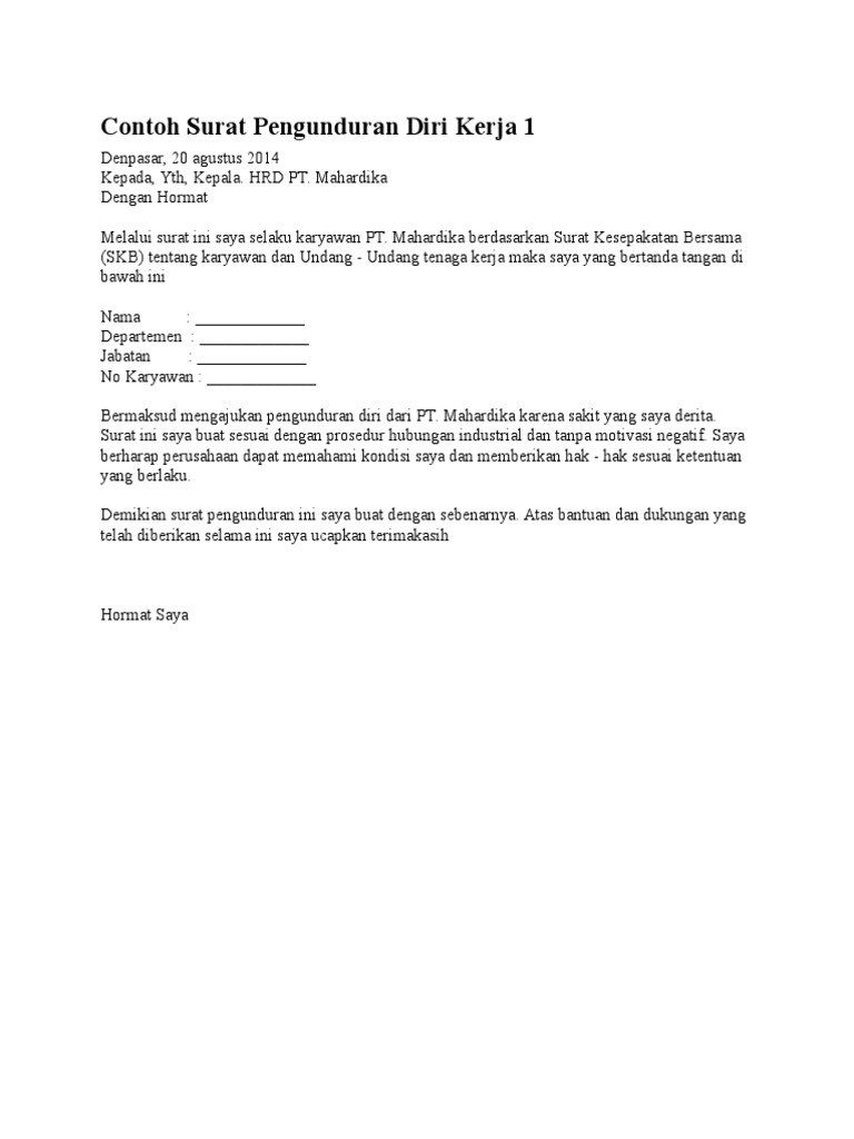 Auto motor indonesia di tempat. Surat pengunduran diri kerja adalah sebuah lembaran pemberitahuan yang disampaikan karyawan kepada atasan untuk mengabarkan keinginannya untuk resign dari perusahaan. Di saat seperti itulah anda membutuhkan contoh surat pengunduran diri sehingga dapat membuat surat resign sebaik mungkin. Contoh surat pengunduran diri dari pekerjaan. Contoh permohonan pengunduran diri kerja karyawan kontrak.